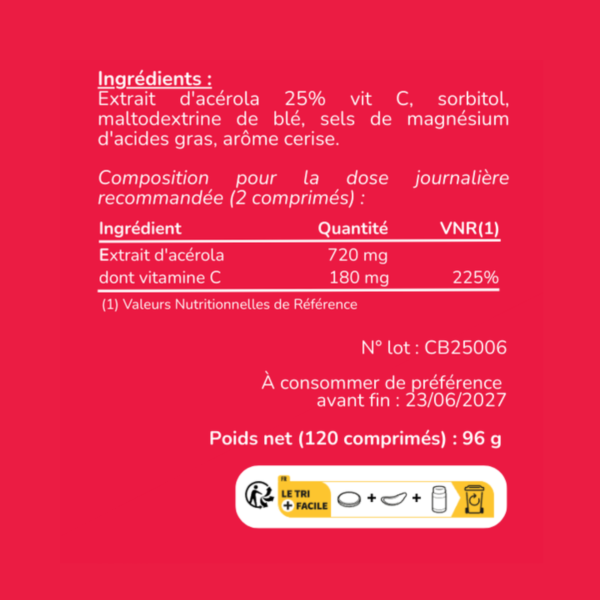 (Ingrédients : Extrait d’acérola 25% vitamine C, édulcorant : sorbitol, maltodextrine de blé, sels de magnésium d’acides gras, arôme cerise).