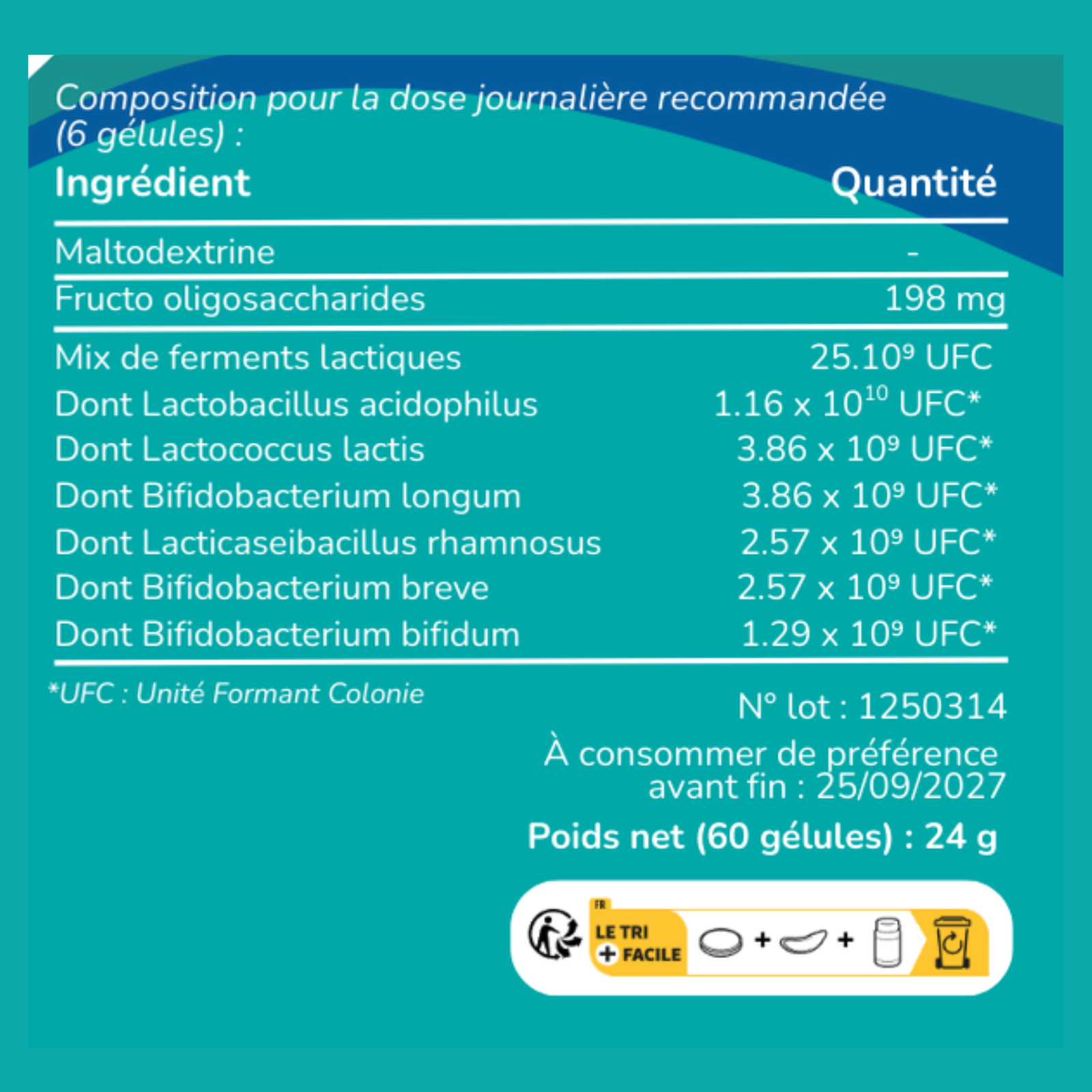 (Ingrédients : Maltodextrine, agent d’enrobage gastro-résistant végétal (HPMC), fructo-oligosaccharides, mix de ferments lactiques).