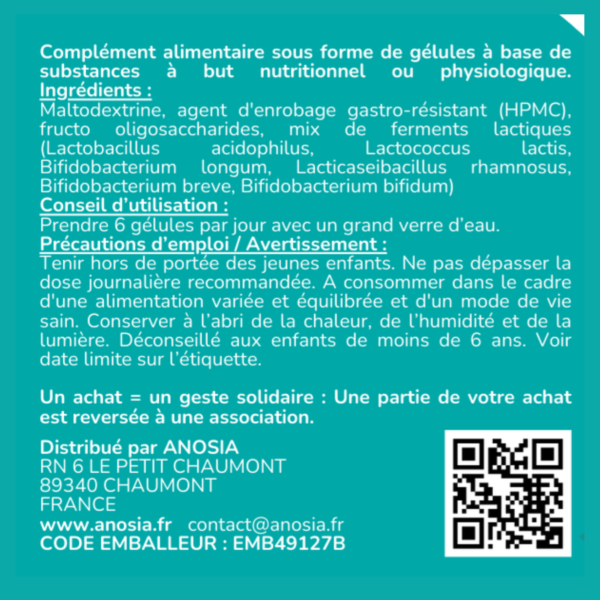 Votre bien-être global commence dans votre ventre ! Notre complexe Probiotiques ANOSIA est une formule « symbiotique » d’exception. Elle réunit 6 milliards de ferments lactiques (issus de 6 souches rigoureusement sélectionnées) et des prébiotiques (FOS). Et pour garantir que ces bonnes bactéries arrivent vivantes jusqu’à vos intestins, nous les avons encapsulées dans des gélules végétales gastro-résistantes. Le programme idéal pour rééquilibrer votre flore intestinale en profondeur.