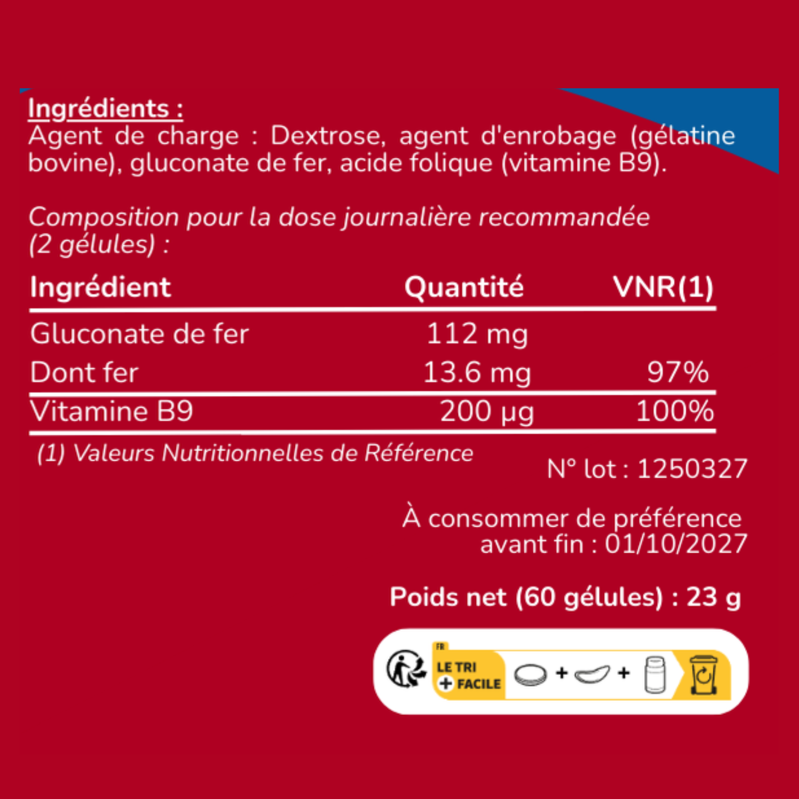 (Ingrédients : Agent de charge : Dextrose, agent d’enrobage : gélatine bovine, gluconate de fer, acide folique).